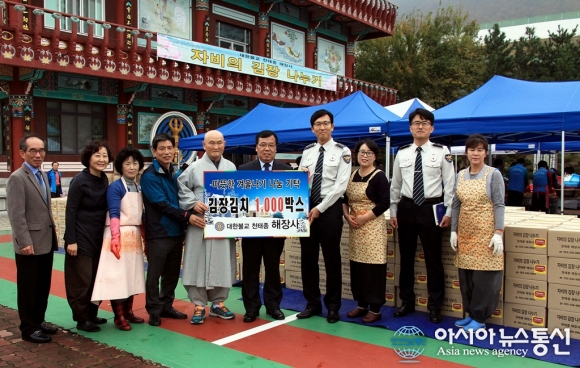 17일 경남 창원시 진해구 해장사에서 신도와 자원봉사자 등이 참여해 담근 김장김치를 어려운 이웃에 전해달라며 정철영 구청장에게 전달하고 있다.(사진제공=창원시청) 경남 창원시 진해구 해장사(대한불교 천태종 용월산 주지스님)는 17일 정성껏 담... 2015-11-17