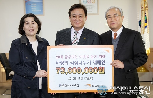 17일 충북도교육청은 월드비젼 충북지부에 중식지원 사업비 7300만원을 전달했다. 왼쪽부터 권순환 월드비전 충북지부 팀장, 김병우 충북도교육감, 조철호 동양일보 회장.(사진제공=충북도교육청) 충북도교육청은 17일 월드비젼 충북지부에 중식지원 ... 2015-11-17