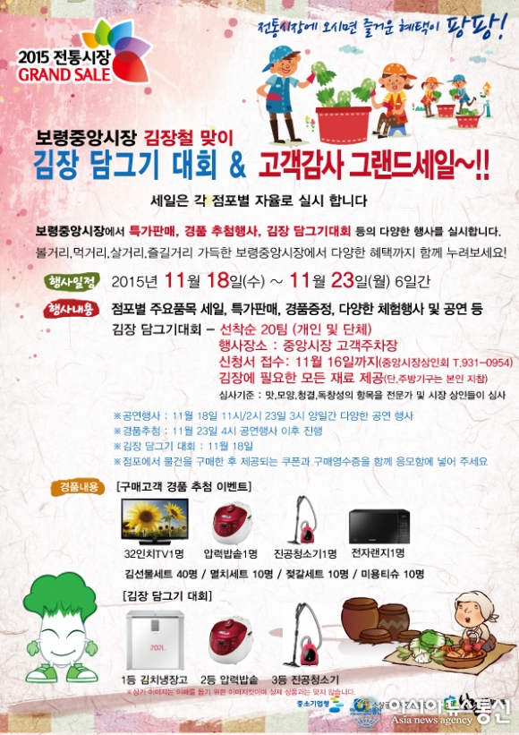 충남 보령중앙시장 행사 안내문.(사진제공=보령시청) 충남 보령중앙시장 문화관광형시장육성사업단(이하 문광형사업단)은 김장철을 맞아 18일부터 6일 동안 김장 담그기 대회와 고객감사 할인 행사를 갖는다. 문광형사업단, 보령중앙시장 상인회가... 2015-11-17