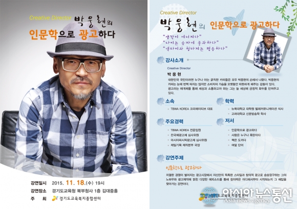경기도교육복지종합센터 '찾아가는 명사 특강' 안내문.(사진제공=경기도교육청) 경기도교육복지종합센터은 오는 18일 오후 7시부터 도교육청 북부청사 1층 김대중홀에서 경기교육가족을 대상으로 '찾아가는 명사 특강'을 개최한다. 이... 2015-11-17
