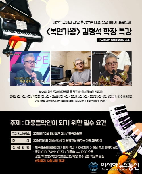 자료사진.(사진제공=한국예술원) 교육부 4년제 예술학사 교육기관 한국예술원(학장 김형석)은 오는 10일부터 서울 충정로에 위치한 한국예술원에서 2016학년도 예비신입생 및 음악인을 꿈꾸는 전국 고등학생들을 위한 한국예술원 김형석 학장의 무료 특... 2015-11-17