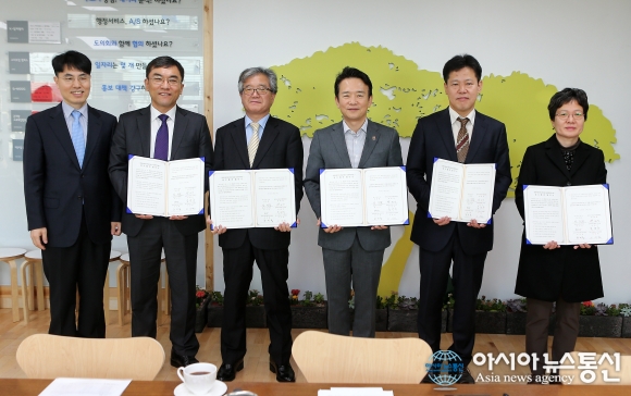 17일 오전 남경필 경기도지사가 집무실에서 경기도시장군수협의회, 통일부 하나원, 남북하나재단, 중부지방고용노동청, 경기지방중소기업청과 함께 '북한이탈주민 취업지원 및 문화격차 해소'를 위한 업무협약을 체결하고 있다.(사진제공=경기도청) ... 2015-11-17