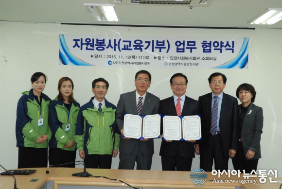 지난 12일 인천중앙도서관은 (사)인천시자원봉사센터와 사회복지회관 소회의실에서 자원봉사(교육기부) 업무에 관한 협약을 체결하고 기념촬영을 하고 있다.(사진제공=인천중앙도서관) 인천중앙도서관(관장 홍순석)은 지난 12일 (사)인천시자원봉사센... 2015-11-14