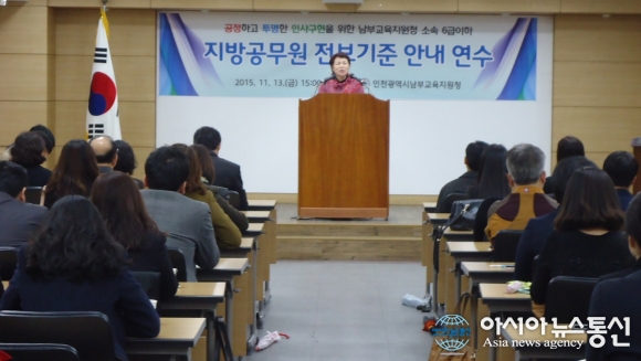 13일 인천남부교육지원청은 대회의실에서 관내 공립 유⋅초⋅중 행정실장을 대상으로 남부교육지원청 소속 6급 이하 지방공무원 전보기준(안)에 대해 연수를 진행하고 있다.(사진제공=인천남부교육지원청) 인천남부교육지원청(교육장 이신근)은 13... 2015-11-14
