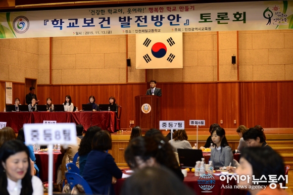 13일 인천교육청은 인천시 부평구 제일고등학교에서 인천시 초, 중, 고 보건교사 200여명을 대상으로 ‘건강한 학교야, 웃어라’라는 주제로 원탁토론회를 진행하고 있다. 사진은 이청연 인천시교육감이 인사말을 하고 있는 모습.(사진제공=인천시교육청) ... 2015-11-14