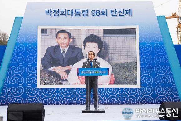 14일 오전 경북 구미시 상모동 고 박정희 전 대통령 생가 기념공원에서 열린 '제98회 박정희 대통령 탄신제'에서 남유진 구미시장이 기념사를 하고 있다.(사진제공=구미시청) 2015-11-15