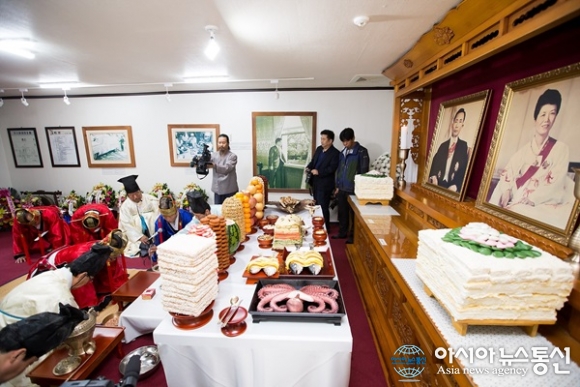14일 오전 경북 구미시 상모동 고 박정희 전 대통령 생가 추모관에서 열린 '제98회 박정희 대통령 탄신제'에서 참석자들이 제례를 올리고 있다.(사진제공=구미시장) 2015-11-15