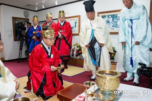 14일 경북 구미 상모동 고 박정희 전 대통령 생가 추모관에서 열린 "제98회 박정희 대통령 탄신제"에서 남유진 구미시장이 제주(祭酒)을 올리고 있다.(사진제공=구미시청) 2015-11-15