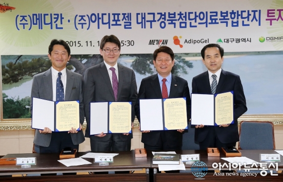 13일 오후 대구시청 상황실에서 대구시가 ㈜메디칸과 ㈜메디칸의 자회사인 ㈜아디포젤을 대구경북첨단의료복합단지에 유치하고, 투자협약을 체결하고 있다. 왼쪽부터 조용우 ㈜아디포젤 대표이사, 이희영 ㈜메디칸 대표이사, 권영진 대구시장, 이재태 (재)대구경북... 2015-11-13