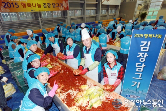 현대제철 우유철 부회장과 임직원들이 소금에 절인 배추에 양념을 버무리고 있다. (사진제공=당진제철소) 현대제철은 13일 충남 당진제철소 실내체육관에서 우유철 부회장과 임직원 등 90여명이 참여한 가운데 '2015 행복나눔 김장 담그기' 행사... 2015-11-13