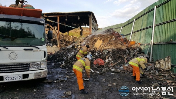 화재피해복구 지원 모습.(사진제공=밀양소방서) 경남 밀양소방서는 12일 화재피해를 입은 초동면 A환경 폐기물공장에 대해 화재피해 복구작업을 지원했다. 이날 복구작업에는 소방공무원과 의용소방대원 등 10여명이 참여해 피해자가 생활안정을 찾... 2015-11-13