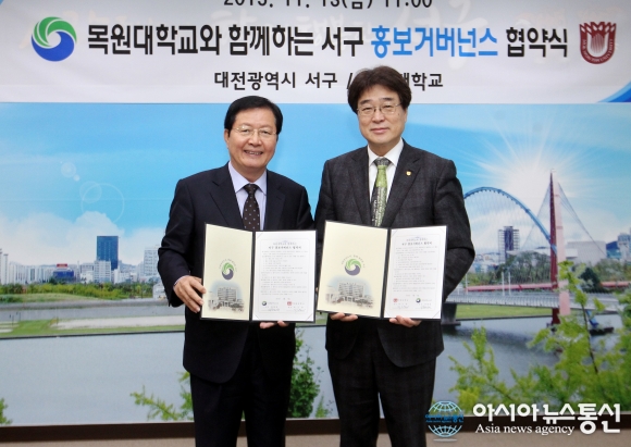 장종태 대전서구청장과 박노권 목원대학교 총장이 13일 '대학과 함께하는 홍보 거버넌스' 협약을 체결하고 기념촬영을 하고 있다.(사진제공=대전서구청) 대전 서구(구청장 장종태)는 13일 구청 다목적실에서 목원대학교와 '대학과 함께하는... 2015-11-13