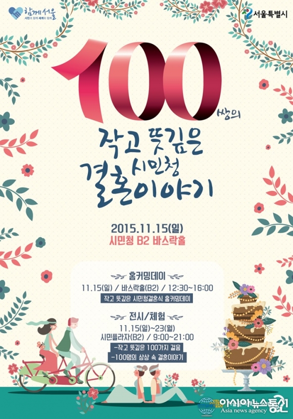 100쌍의 작고 뜻깊은 시민청 결혼이야기 포스터.(사진제공=서울시) 서울시(시장 박원순)가 허례허식을 벗고 개성을 담은 작고 뜻깊은 결혼식 문화를 확산하기 위해 지난 2013년 시민청 개관과 함께 시작한 '시민청결혼식'의 100호 커플이 오는 15일 탄... 2015-11-13