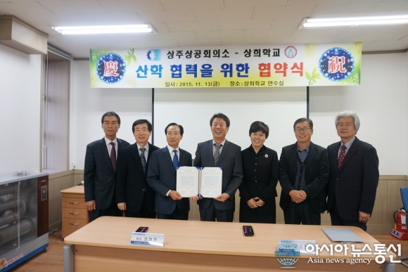 13일 정하록 상주상공회의소 회장(왼쪽 세번째)과 이승진 상희학교장(왼쪽 네번째)은 산학 협력을 위한 협약을 체결한 후 관계자들과 함께 포즈를 취하고 있다.(사진제공=상희학교) 경북 상주상공회의소(회장 정하록)와 상희학교(교장 이승진)는 13일 ... 2015-11-13