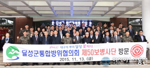 13일 달성군통합방위협의회 위원 50명이 제4분기 정기회의를 맞아 제50보병사단을 방문, 통합방위에 대한 상호협력과 지역사회 발전에 대한 의지를 다지고 파이팅을 외치며 기념촬영을 하고 있다.(사진제공=달성군청) 대구 달성군통합방위협의회(의장 ... 2015-11-13