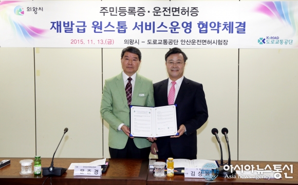 13일 오전 10시 경기 의왕시청 소회의실에서 의왕시와 안산운전면허시험장이 주민등록증과 운전면허증 재발급 신청 통합처리를 위한 업무협약을 체결한 가운데 김성제 시장(오른쪽)과 문춘경 시험장장이 기념촬영을 하고 있다. (사진제공=의왕시청) 주민... 2015-11-13