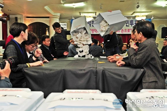 12일 오후 8시를 기해 경북 영덕군 내 20곳 투표소에서 진행된 영덕 신규원전 건설 관련 '유치찬반'을 묻는 민간주도 주민투표가 완료된 가운데 최종 집계가 늦어지면서 이날 오후 11시50분 영덕읍 투표함 개봉을 시작으로 개표위원들이 개표작업을 하고 있다./아... 2015-11-13