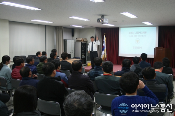 12일 오후 남영창 교통계장(맨앞)이 영양우체국 직원들을 대상으로 교통사고예방 강의을 하고 있다.(사진제공=영양경찰서) 경북 영양경찰서(서장 구자용)는 최근 농산물 수확을 마무리 하면서 일몰 전.후 보행자 및 농기계 이동으로 인한 교통사고 우... 2015-11-13