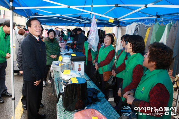 12일 오전 김주수 군수(왼쪽)가 판매 부스을 찾아 참가자들을 격려 하고 있다.(사진제공=의성군청) 경북 의성군(군수 김주수)은 12일 의성읍 복개천 서편 주차장에서 '제7회 자원사랑 나눔장터'를 개최했다. 전 군민이 자원의 소중함을 인식하고... 2015-11-13