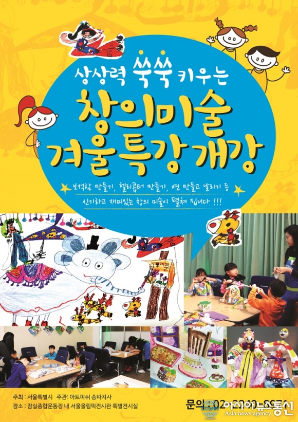서울시 창의미술 겨울특강 포스터.(사진제공=서울시) 서울시(시장 박원순) 체육시설관리사업소는 오는 12월5일부터 다음해 1월31일까지 유아 및 초등학생 어린이들을 대상으로 '함께서울 창의미술특강'을 운영한다. '함께서울 창의미술특강... 2015-11-13