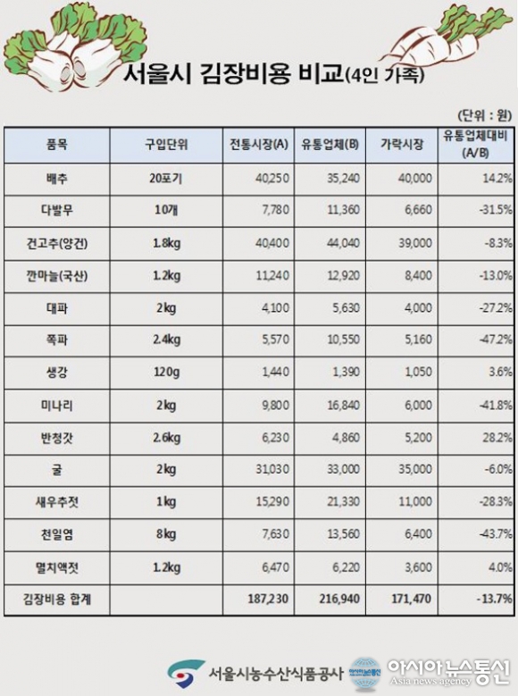 김장비용 비교ㆍ조사표.(사진제공=서울시 농수산식품공사) 서울시 농수산식품공사(사장 박현출)는 김장 성수기를 앞두고 서울시내 전통시장과 대형 유통업체를 대상으로 4인 가족 김장비용을 비교·조사해 발표했다. 공사는 지난 4~5일까지 마포... 2015-11-13