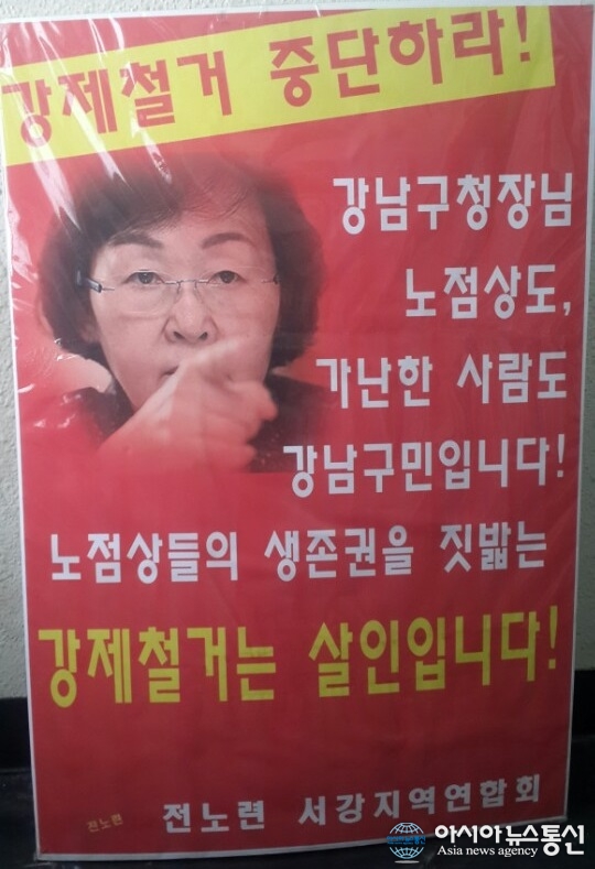 전국노점상총연합회 서초강남지역연합의 시위 피켓./아시아뉴스통신=전혁수 기자 강남구청과 노점상들의 갈등이 깊어지는 가운데 연일 강남구청 앞에서 노점강제철거를 반대하고 신연희 강남구청장을 비난하는 시위가 벌어지고 있다. 지난 10일 민... 2015-11-13
