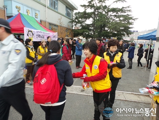 12일 충북 영동 다사랑봉사단(회장 신중애)이 2016학년도 대학수학능력시험이 치러진 영동고등학교 시험장을 찾아 수험생들에게 사탕을 나눠주는 봉사활동을 벌였다.(사진제공=영동군청) 충북 영동 다사랑봉사단(회장 신중애)은 2016학년도 대학수학능... 2015-11-13