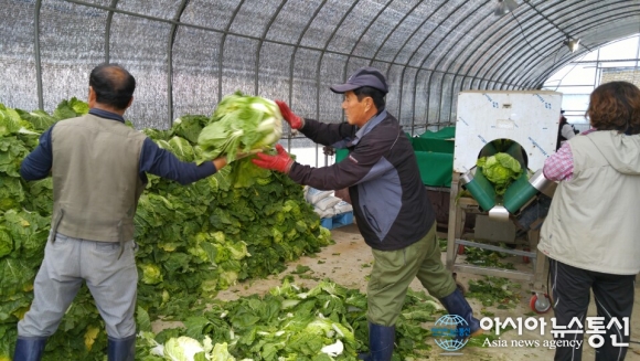 13일 충북 괴산군 청천면 한 농가에서 절임배추작업을 하고 있는 구직자.(사진제공=괴산군청) 충북 괴산군 일자리Hub센터는 일손부족 등으로 어려움을 겪는 농가를 위해 13일부터 한 달간 청천면 소재 절임배추농가에서 농번기 일손 지원 프로그램인 &l... 2015-11-13