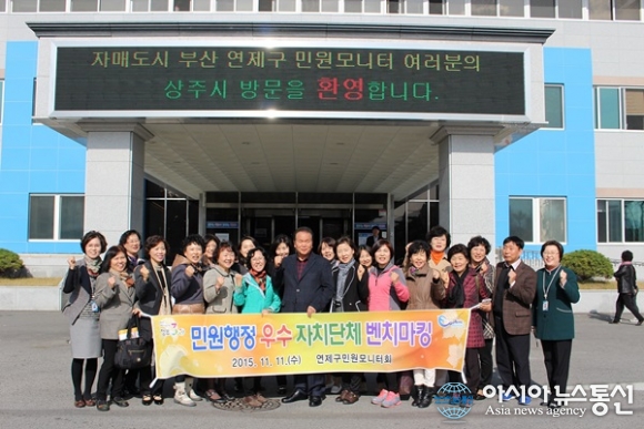 지난 11일 이정백 경북 상주시장이 시청 종합민원실을 벤치마킹하기 위해 방문한 자매도시인 부산 연제구 민원모니터 회원 20명과 함께 기념사진을 찍고 있다. 상주시는 '2015년 정부3.0 국민행복 민원실'로 선정된 바 있다.(사진제공=상주시청) 2015-11-13