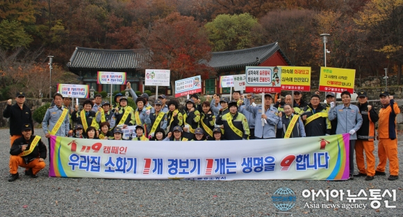지난 11일 달성군 비슬산 자연휴양림에서 대구달성소방서가 의용소방대원 50여명과 함께 등산객 등을 대상으로 산불 예방 캠페인을 실시한 후 단체촬영을 하고 있다.(사진제공=대구달성소방서) 대구달성소방서(서장 정남구)는 지난 11일 달성군 비슬산... 2015-11-13