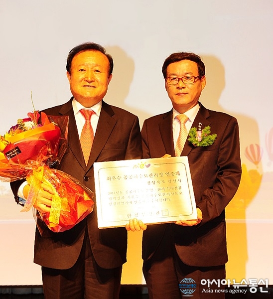 12일 박보생 경북 김천시장이 환경부가 주관한 평가에서 최우수상을 수상한 후 포즈를 취하고 있다.(사진제공=김천시청) 경북 김천시는 12일 환경부에서 실시한 '2015년도 공공하수도 운영관리 실태평가'에서 전국 최우수기관으로 선정돼 시상금... 2015-11-13