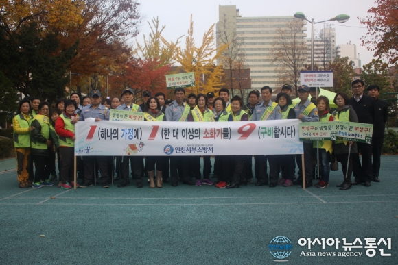 11일 인천서부소방서가 서구 석남동에 위치한 강남시장 및 석남체육공원 일대에서 범시민 안전문화 확산을 위한 테마형 안전 캠페인 행사를 진행하고 기념촬영을 하고 있다.(사진제공=인천서부소방서) 인천서부소방서(서장 박을용)는 11일 서구 석남동... 2015-11-12