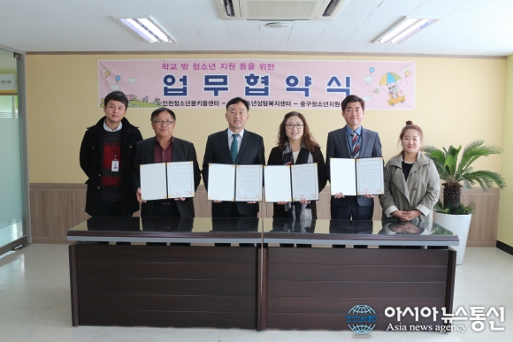 12일 인천청소년꿈키움센터는 인천중구청소년지원센터 꿈드림와 지역사회 위기청소년의 조기발견과 청소년 비행예방을 위한 통합서비스를 제공할 수 있도록 협조체제를 구축하고 연계활성화 기반을 마련하기 위한 업무협약을 체결하고 기념촬영을 하고 있다.(사진제... 2015-11-12