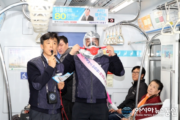 11일 인천교통공사가 운행 중인 열차에서 승객들을 대상으로 비상 시 시민행동요령 홍보를 진행하고 있다.(사진제공=인천교통공사) 인천교통공사(사장 이정호)는 11일 운행 중인 열차에서 승객들을 대상으로 비상 시 시민행동요령 홍보를 실시했다. ... 2015-11-12
