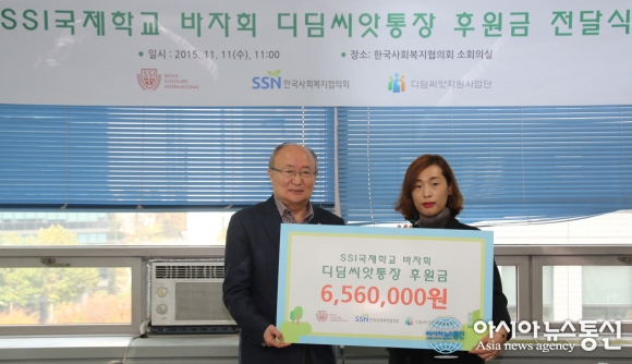 11일 한국사회복지협의회 정구훈 상근부회장(왼쪽)은 SSI국제학교로부터 학부모회가 바자회를 통해 모금한 디딤씨앗통장 후원금 656만원을 전달받았다.(사진제공=한국사회복지협의회 대외홍보실) 한국사회복지협의회(회장 차흥봉) 11일 한국사회복지회... 2015-11-12