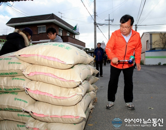 12일 정찰영 진해구청장이 '2015년도 공공비축미곡' 수매 현장에서 포대에 등급 도장을 찍고 있다.(사진제공=창원시청) 경남 창원시 진해구(구청장 정철영)는 12일 '2015년도 공공비축미곡' 수매를 웅천지역은 관정마을, 웅동지역은 소사마... 2015-11-12