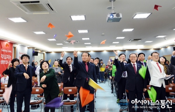 12일 경북 상주적십자병원 개원 60주년 기념식에 참석한 주요 내빈들이 병원 발전과 환자들의 쾌유를 기원하는 소망을 적은 종이비행기를 날리고 있다. 사진 오른쪽부터 이상수 병원장, 강호권 대한적십자 사무총장,이정백 상주시장, 남영숙 상주시의회 의장, 손현찬 상... 2015-11-12