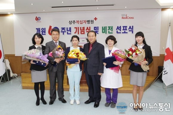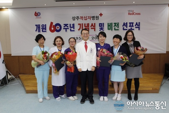 12일 이상수 경북 상주적십자병원장이 개원 60주년 기념식에서 병원 발전에 기여한 직원에 대해 시상한 후 기념사진을 찍고 있다. 수상자는 김필안, 박상미, 양정숙, 이화연, 임태영, 이경진 등 6명이다./아시아뉴스통신=김철희 기자 2015-11-12