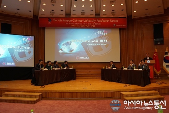 지난 9일부터 10일까지 한양대 백남학술정보관 6층 국제회의실에서 열린 제7회 한·중대학총장포럼에 충북대학교 윤여표 총장(맨오른쪽 연단)이 참여해 '대규모 공개 온라인강좌와 교육혁신'이란 주제로 발표를 가졌다.(사진제공=충북대학교) ... 2015-11-12
