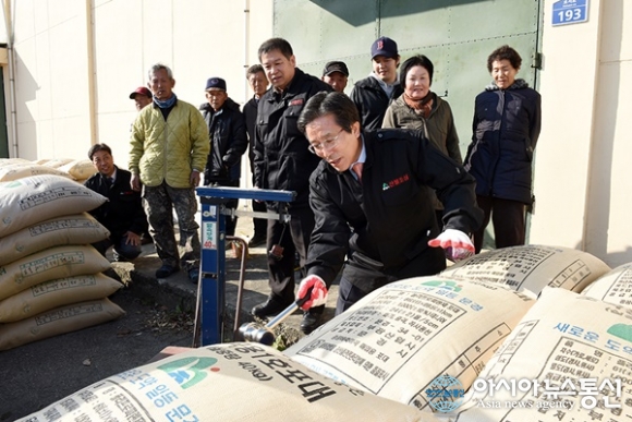 12일 고윤환 경북 문경시장이 추곡 포대에 등급을 새기고 있다.(사진제공=문경시청) 경북 문경시는 2015년 공공비축미곡 19만7000포대를 매입한다. 이는 당초 시에 배정된 13만2000포대에 시장격리곡 6만4000포대를 추가로 매입한 수치다. 시장격리곡... 2015-11-12