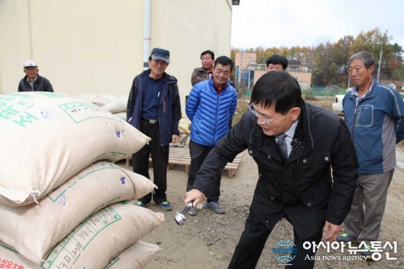 충남 금산군 박동철 군수는 지난 11일 2015년산 공공비축미곡 건조벼 첫 매입을 실시하는 금산읍 축협창고를 방문했다.(사진제공=금산군청) 충남 금산군(박동철 군수)는 11일 2015년산 공공비축미곡 건조벼 첫 매입을 실시하는 금산읍 축협창고를 방문해 ... 2015-11-12