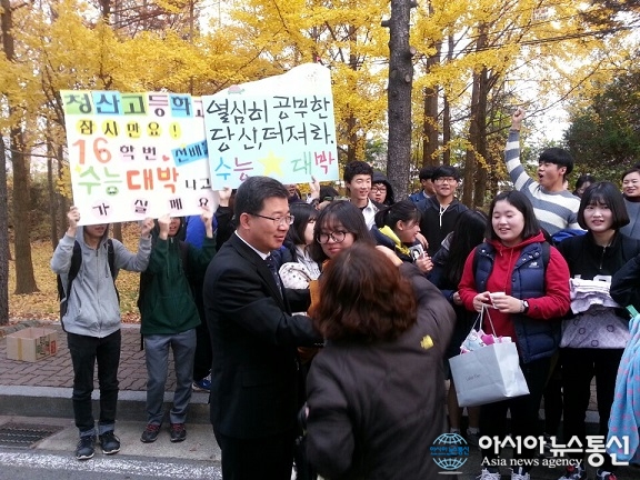12일 정병걸 충북도부교육감(맨앞 왼쪽)은 류웅렬 옥천교육장과 함게 대학수학능력시험이 치러진 옥천고등학교를 찾아 수험생과 시험관계자들을 격려했다.(사진제공=옥천교육지원청) 정병걸 충북도부교육감과 류웅렬 옥천교육장은 12일 대학수학능... 2015-11-12