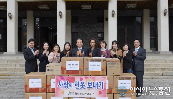 12일 경북관광공사가 지난 10월 한달간 임직원들의 가정 장롱속에 잠자던 의류를 모아 환경부 소속 비영리민간단체인 '옷캔'에 기증하고 기념촬영을 하고 있다.(사진제공=경상북도관광공사) 지역사회를 위해 다양한 사회공헌 활동을 펼치고 있... 2015-11-12