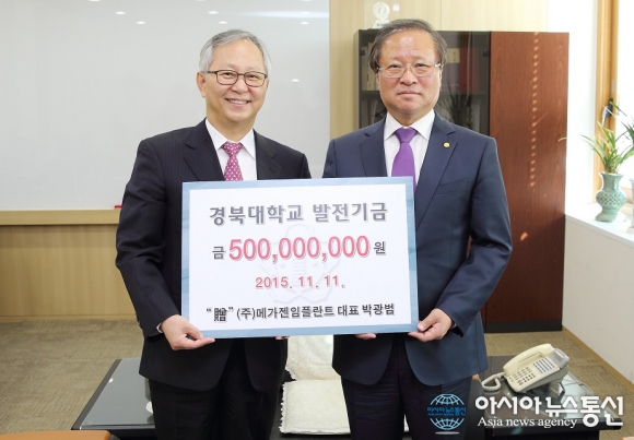 11일 손동철 경북대 총장 직무대리(오른쪽)를 방문한 박광범 메가젠임플란트 대표(왼쪽)가 후배들과 치의학 발전을 위해 써달라며 발전기금 5억원을 전달한 후 기념촬영을 하고 있다.(사진제공=경북대) 경북대 동문인 박광범 메가젠임플란트 대표가 경... 2015-11-12