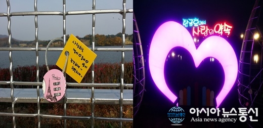 충북 충주시 탄금호국제조정경기장에 설치된 ‘사랑의 자물쇠’ 거치대(왼쪽)와 포토존.(사진제공=충주시청) 충북 충주시가 유럽에서 높은 인기로 관광객 유인효과가 큰 ‘사랑의 자물쇠’ 거치대와 LED조명을 이용한 포토존을 탄금호국... 2015-11-12