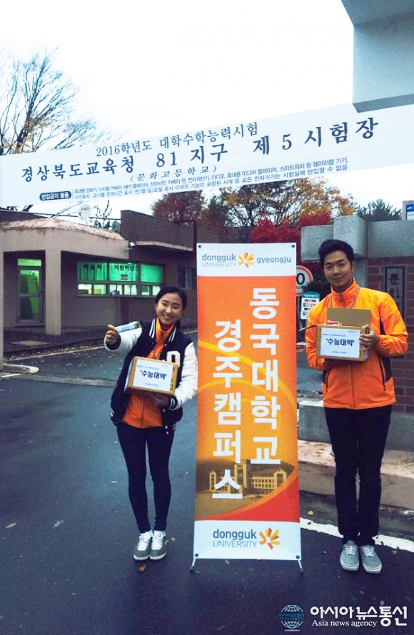 12일 오전 동국대학교 경주캠퍼스가 경주 지역 수능 고사장을 방문해 수험생을 응원하는 이벤트를 펼치고 있다.(사진제공=동국대학교 경주캠퍼스) 동국대학교 경주캠퍼스(총장 직무대행 정윤길)는 12일 대학수학능력시험일을 맞아 경주 지역 수능 고... 2015-11-12