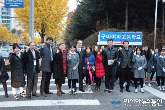 12일 오전 김정숙 경북 구미교육지원청 교육장(왼쪽 네번째)이 구미여고 정문앞에서 임종식 교육정책 국장, 이정호 구미 학교운영위원장, 수학능력시험 관계자 등과 함께 고사장에 입실하는 수험생들을 응원하며 "화이팅"을 외치고 있다. 이날 구미시는 9개 고사... 2015-11-12