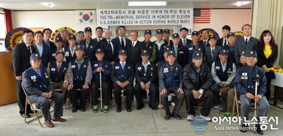 12일 경남 남해군 미공군전공기념관에서 거행된 미공군 장병 11명의 영령에 대한 ‘제70주년 추도식'에 참석한 6.25참전용사를 비롯해 새남해로타리클럽 회원 등 사진촬영 모습(사진제공=남해군청) 미공군 장병 11명의 영령에 대한 ‘제70주년 ... 2015-11-12