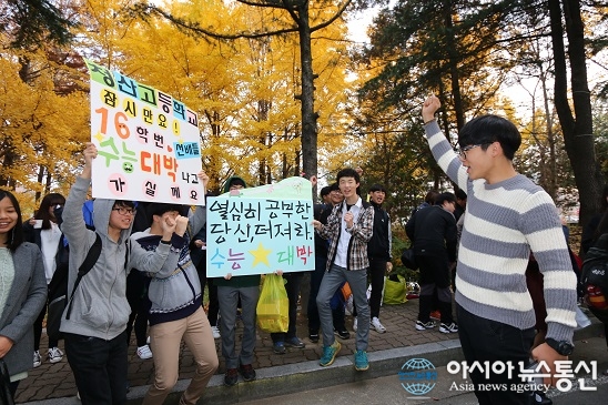 12일 2016학년도 대학수학능력시험이 치러진 충북 옥천고등학교 교문 앞은 수험생을 응원하러 나온 선후배 학생과 교사, 학부모 등의 열띤 함성소리로 후끈 달아올랐다.(사진제공=옥천군청) 2016학년도 대학수학능력시험이 치러진 12일 충북 옥천고등학... 2015-11-12