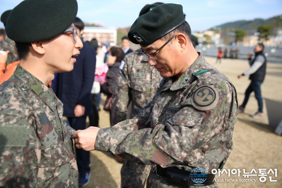 12일 문병호 육군 39사단장이 신병교육을 마친 장병에게 계급장을 달아주고 있다.(사진제공=육군 39사단) 문병호 육군 제39보병사단장은 12일 오전 취임 후 처음으로 신병교육 수료식을 주관했다. 함안군 군북면에 위치한 사단사령부 대연병장에서 시... 2015-11-12